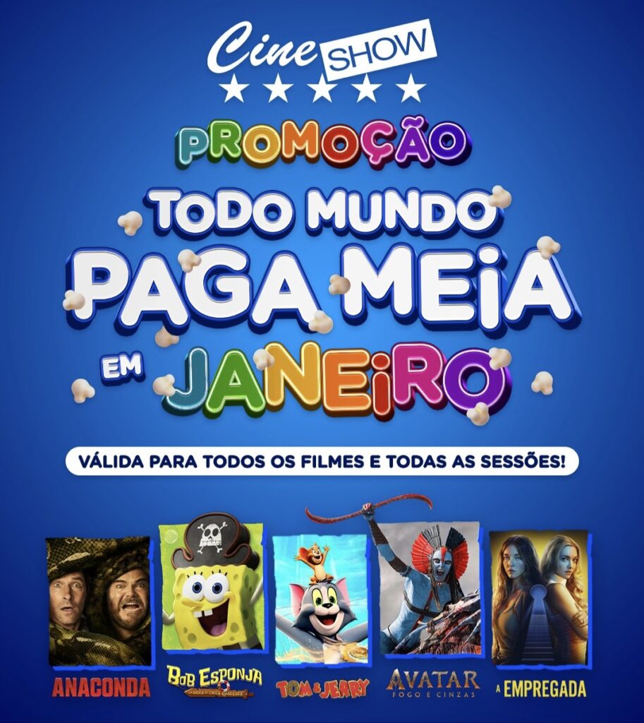 Durante todo o mês de janeiro de 2026, o Cine Show Volta Redonda participa da campanha “Todo Mundo Paga Meia”, que garante meia-entrada para todos os espectadores, sem exceção.